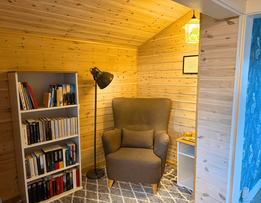 Het Zweedse Nest ligt aan de rand van een dorp, tegenover een rustige riviertje. Het huis heeft een warm, typisch Zweeds interieur en voelt meteen als een plek waar je langere tijd kunt verblijven. Binnen is er volop ruimte om samen te werken en te leven, met een grote eettafel, een comfortabele woonkamer en een kleine bibliotheek voor rustige momenten tussendoor.