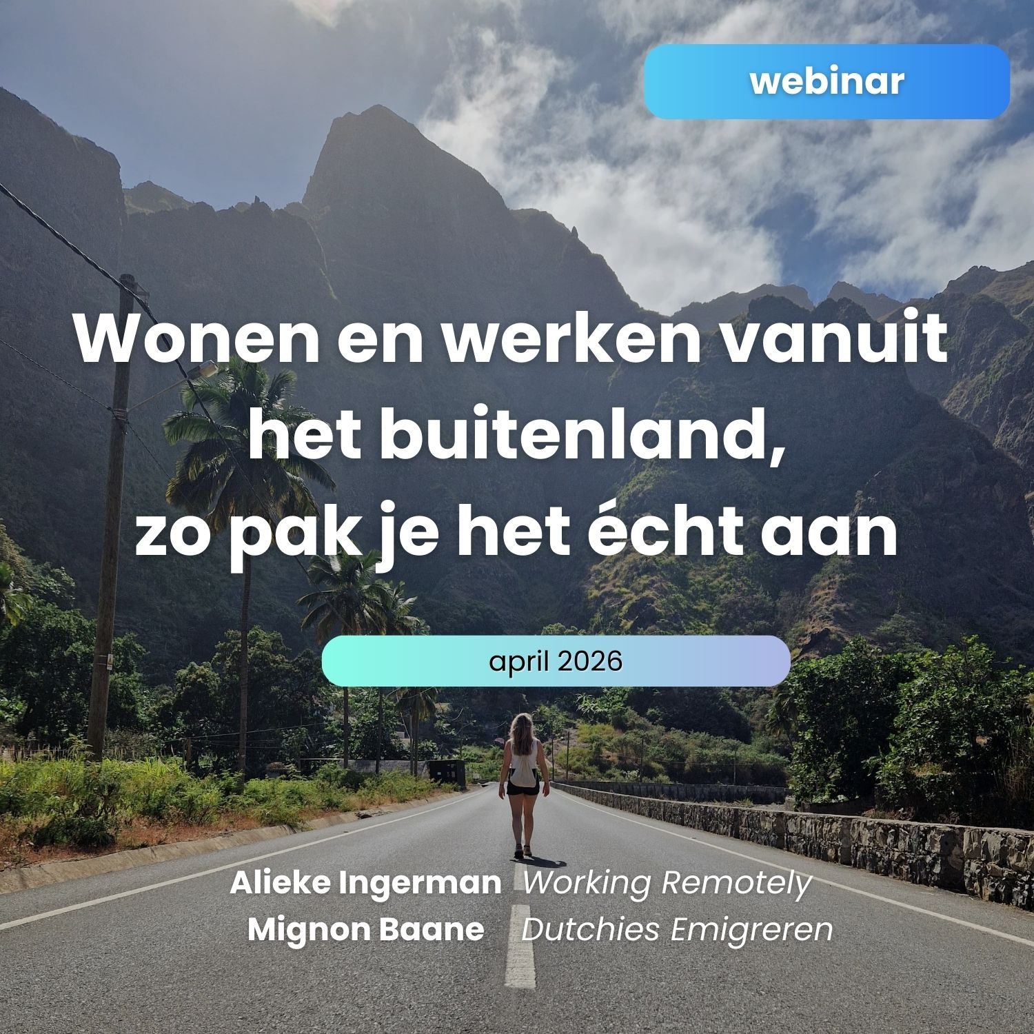 Alieke van Working Remotely gaat dieper in op het werken vanuit het buitenland, wat ze zelf ook al 8 jaar doet. Want of je nu voor een paar maanden vertrekt of permanent wilt emigreren: zonder inkomen kom je nergens. Tijdens het webinar nemen we alle scenario’s door. Van remote werken in loondienst tot freelancen en het opstarten van je eigen onderneming. Je krijgt heldere voorbeelden, realistische opties en concrete tips van deze ervaringsdeskundige.